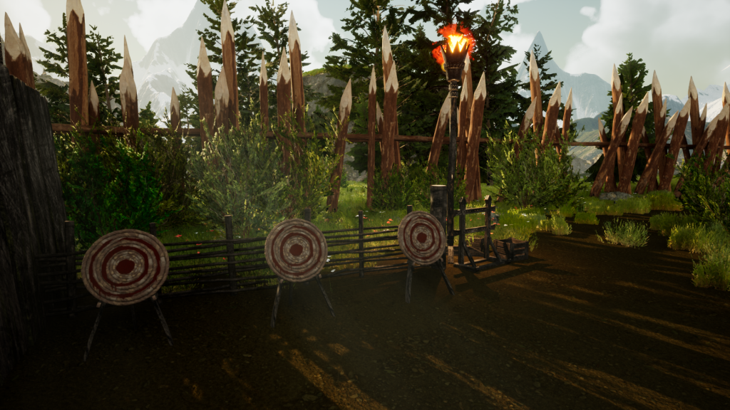 A lot of set-dressing work went into the game’s first settlement last month, from new wooden huts and archery ranges, to stone wells and various metal cages. Most excitingly, we added a brand new bridge that players will walk across as they travel from the starting zone to the first settlement - in fact, when you look at the screenshot below, you’ll notice the Guard House poking its head out in the horizon beyond the bridge!